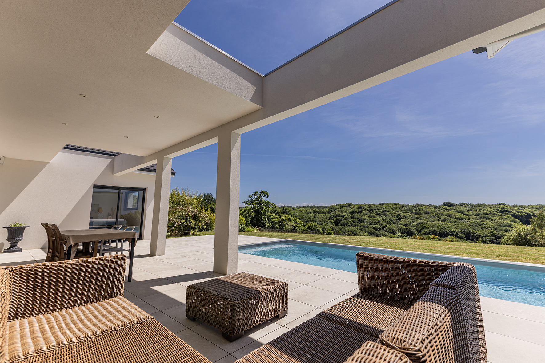 D’une surface de 177 m2 habitables, elle propose : - Un vaste séjour baigné de lumière, avec larges baies vitrées ouvrant sur la terrasse et la piscine, - Une cuisine sur-mesure, sobre et élégante, parfaitement intégrée, - 4 chambres, dont une suite parentale avec salle d’eau privative, - Une salle d’eau supplémentaire, deux WC indépendants, - Un garage double de 47 m2, entièrement isolé.
